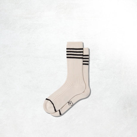 In off-white and black, these Nudie Jeans socks channel a clean, sport-classic mood with a refined edge. Knitted from organic cotton in a midweight 3x1 rib, they’re soft yet structured — built to hold shape through daily wear. The subtle contrast striping gives a nod to vintage gym gear, while the intarsia-knit Nudie logo on the sole keeps the branding minimal and grounded. Made in Portugal, they’re thoughtfully finished for comfort, breathability, and easy pairing with sneakers, loafers, or boots alike.