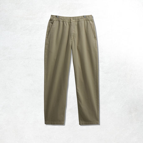 This version is cut from a cotton–linen blend twill, giving the fabric a subtle texture and a dry hand that softens with wear. The linen content introduces breathability and a faint slub, while the cotton base keeps the structure intact—durable enough for daily rotation without feeling rigid. An elasticated waistband with an internal drawcord keeps the profile clean but adaptable, striking that balance between tailored and off-duty that Wax does so well.